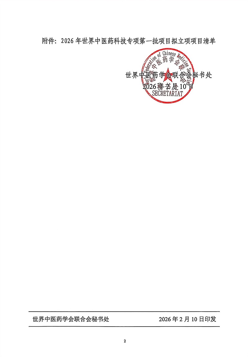 2025年10月,我会正式发布《世界中医药科技专项2025年第二批项目申报指南》。2026年,经过形式审查、专家评审等环节,拟对“尿毒清颗粒治疗慢性肾脏病相关瘙痒的多中心随机双盲安慰剂对照研究”等17个项目予以立项,现对拟立项项目名单进行公示,公示时间为5个工作日,从2月10日至2月14日。在此期间如有异议,请以书面信函或电子邮件形式实名向我会反映。
