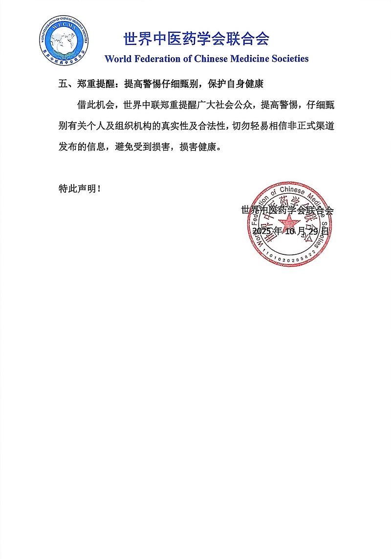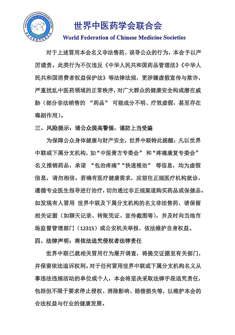 世界中联作为专注于中医药学术交流、国际合作、人才培养、标准化建设和科研创新的国际学术组织,是非营利性专业机构。世界中联从未授权任何单位或个人以 世界中联及所属分支机构名义开展药品、保健品、医疗器械等商品的销售业务,也从未自行生产、代理或推荐任何用于盈利的相关产品。任何以 世界中联或下属分支机构名义进行的售药行为,均属于冒用本会身份的非法行为,与本会无任何关联。