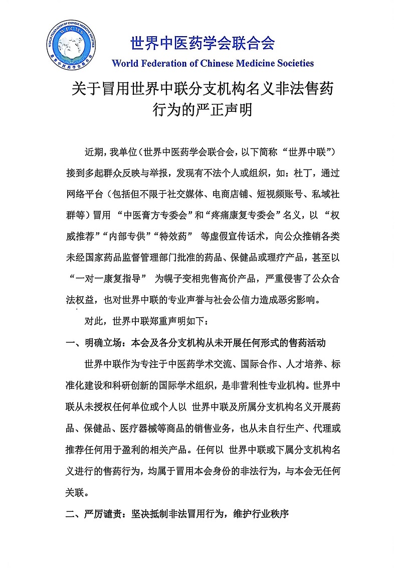 近期,我单位(世界中医药学会联合会,以下简称 “世界中联”)接到多起群众反映与举报,发现有不法个人或组织,如:杜丁,通过网络平台(包括但不限于社交媒体、电商店铺、短视频账号、私域社群等)冒用 “中医膏方专委会”和“疼痛康复专委会”名义,以 “权威推荐”“内部专供”“特效药” 等虚假宣传话术,向公众推销各类未经国家药品监督管理部门批准的药品、保健品或理疗产品,甚至以 “一对一康复指导” 为幌子变相兜售高价产品,严重侵害了公众合法权益,也对世界中联的专业声誉与社会公信力造成恶劣影响。