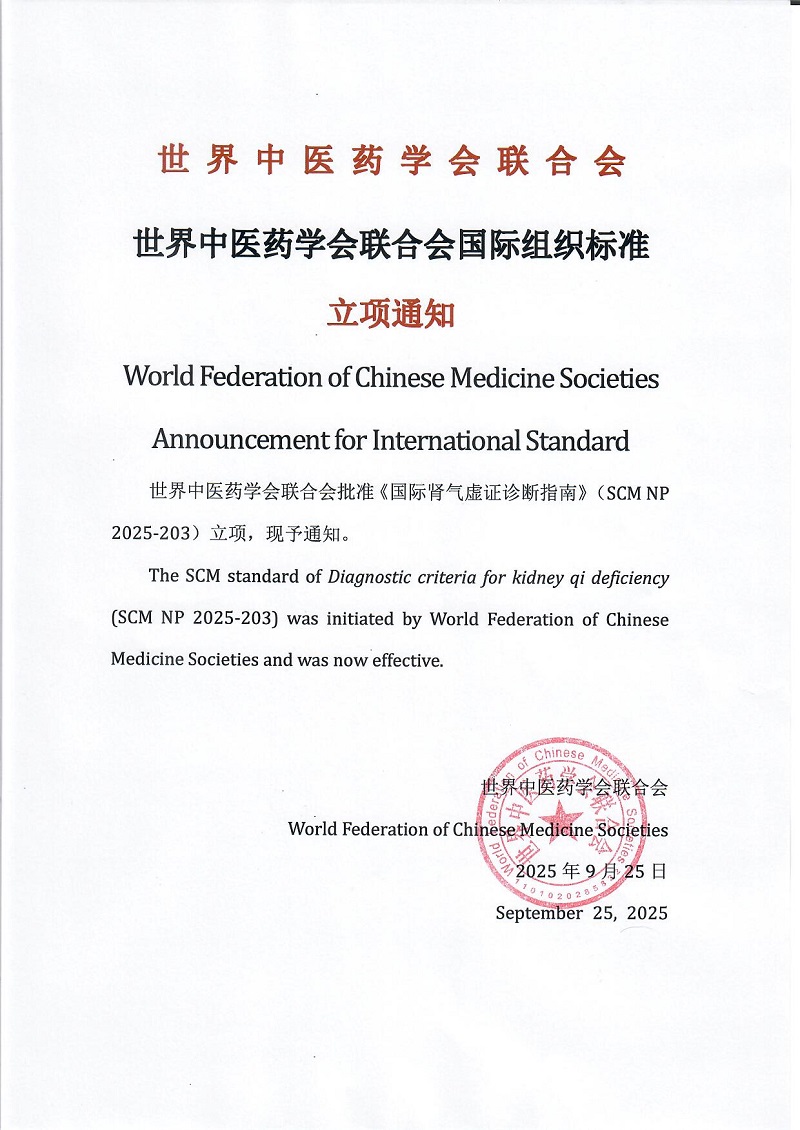 The SCM standard of Diagnostic criteria for kidney qi deficiency (SCM NP 2025-203) was initiated by World Federation of Chinese Medicine Societies and was now effective.