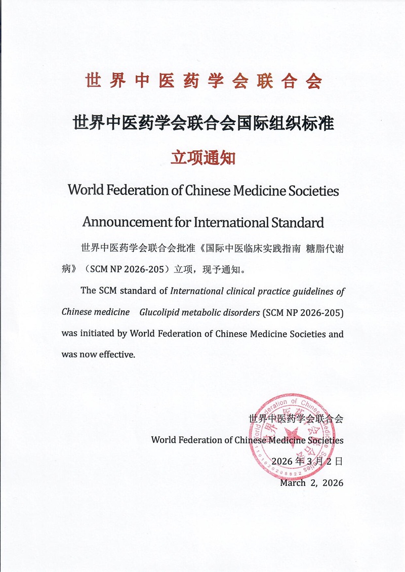 世界中医药学会联合会批准《国际中医临床实践指南 糖脂代谢病》(SCM NP 2026-205)立项,现予通知。