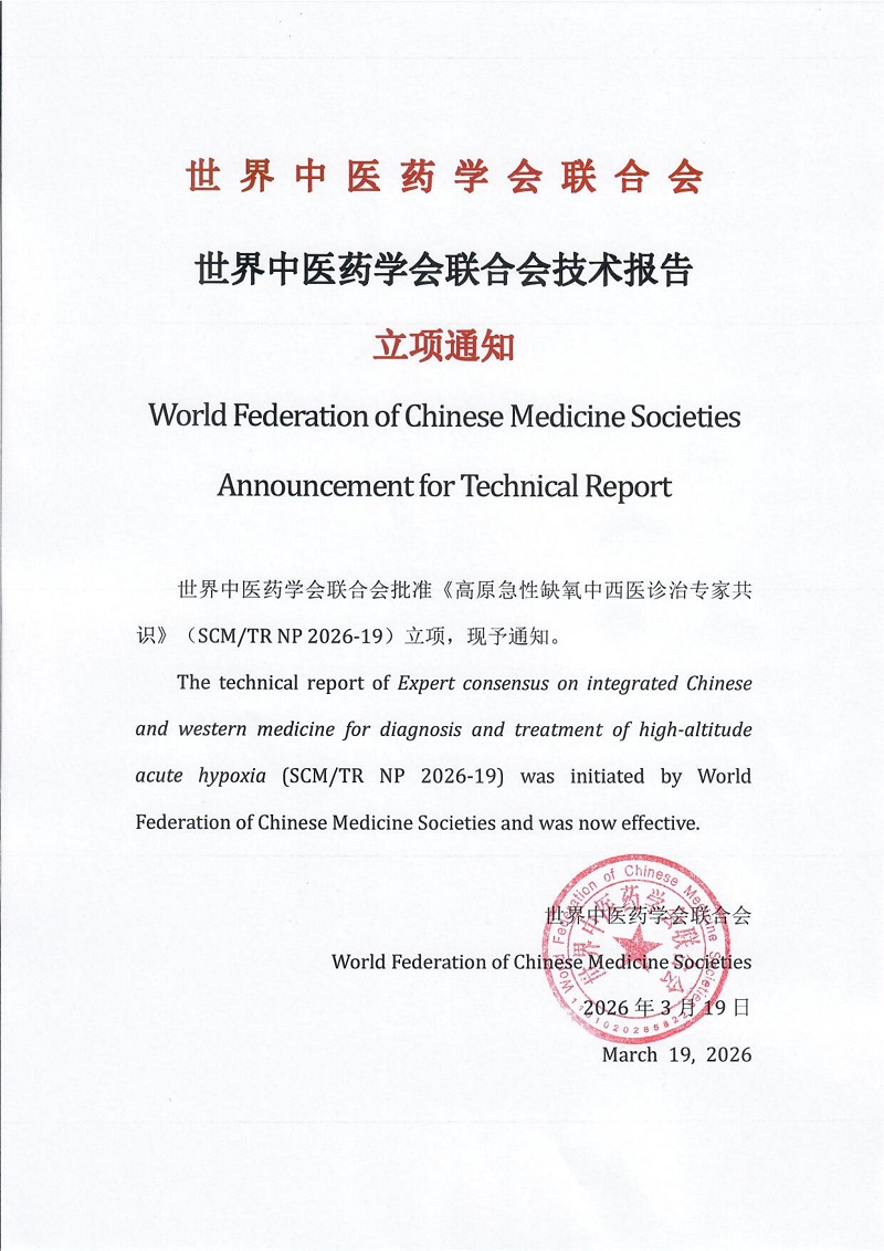 The technical report of Expert consensus on integrated Chinese and western medicine for diagnosis and treatment of high-altitude acute hypoxia (SCM/TR NP 2026-19) was initiated by World Federation of Chinese Medicine Societies and was now effective.