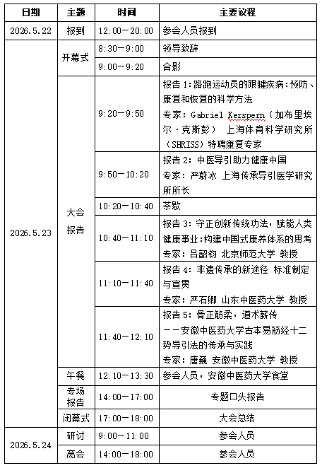 为构建人类卫生健康共同体,进一步推动医体融合的深度发展,助力全民健康战略,探索医体融合的创新路径与实践模式,由世界中医药学会联合会主办、世界中医药学会联合会体育健康产业分会、安徽中医药大学承办的第四届医体融合研讨会定于2026年5月22日-24日在安徽中医药大学举行,现将大会有关事宜通知如下: