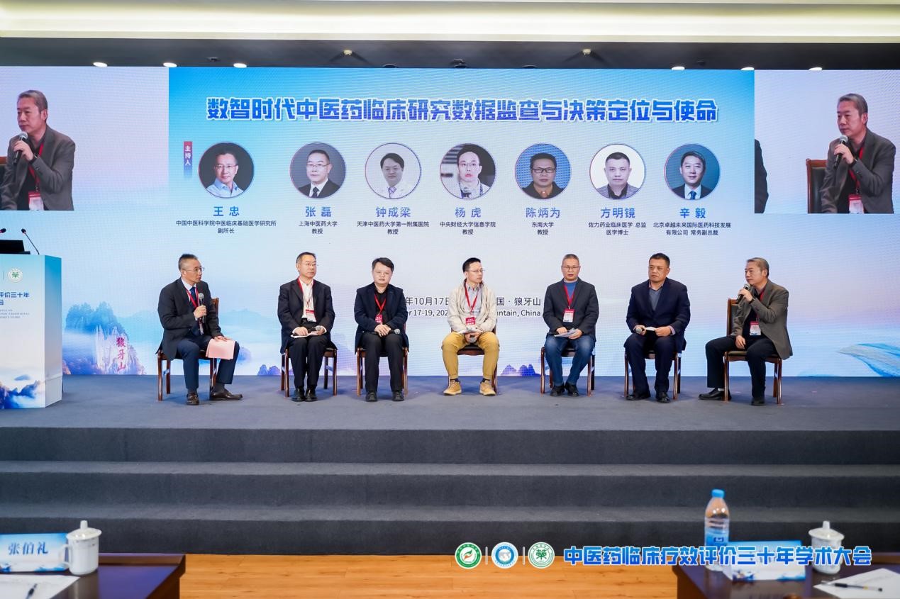 在专题报告后的圆桌讨论环节,一场以“数智时代中医药临床研究数据监查与决策的定位与使命”为主题的对话尤为引人关注。该环节由中国中医科学院中医临床基础医学研究所王忠研究员主持,邀请上海中医药大学张磊教授、天津中医药大学第一附属医院钟成梁教授、中央财经大学信息学院杨虎教授、东南大学陈炳为教授、浙江佐力药业股份有限公司临床医学部总监方明镜以及北京卓越未来国际医药科技发展有限公司常务副总裁辛毅共同参与。