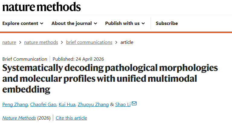 4 月24日,清华大学北京市中医药交叉研究所所长、欧洲科学与艺术院院士李梢课题组在国际顶刊《自然·方法》(Nature Methods)发表了题为《基于统一多模态嵌入的病理形态与分子图谱系统解码》(Systematically decoding pathological morphologies and molecular profiles with unified multimodal embedding)的研究论文(图1)。该文系统揭示出基于影像信息的中西医宏、微观跨层次网络模块化关联规律,创建了一套具有深度可解释性的影像-分子跨层次网络关系推断统一模型,率先实现了多尺度影像与多组学信息的跨层次从头推断与整合,并应用于发现疾病发生发展与药物干预的影像-分子多模态融合标志物,对于运用人工智能理解疾病宏微观复杂关联原理、推动中西医智能与精准防治具有重要意义。