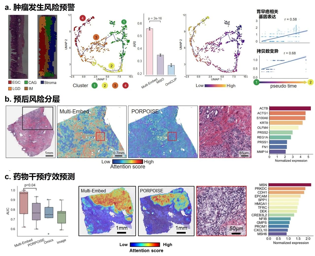 图3.基于Multi-Embed的影像-分子多模态融合标志物发现:a. 肿瘤发生预警,b. 预后风险分层,c. 药物干预疗效预测
