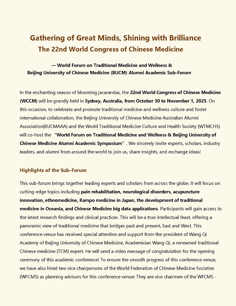 Gathering of Great Minds, Shining with Brilliance The 22nd World Congress of Chinese Medicine — World Forum on Traditional Medicine and Wellness & Beijing University of Chinese Medicine (BUCM) Alumni Academic Sub-Forum