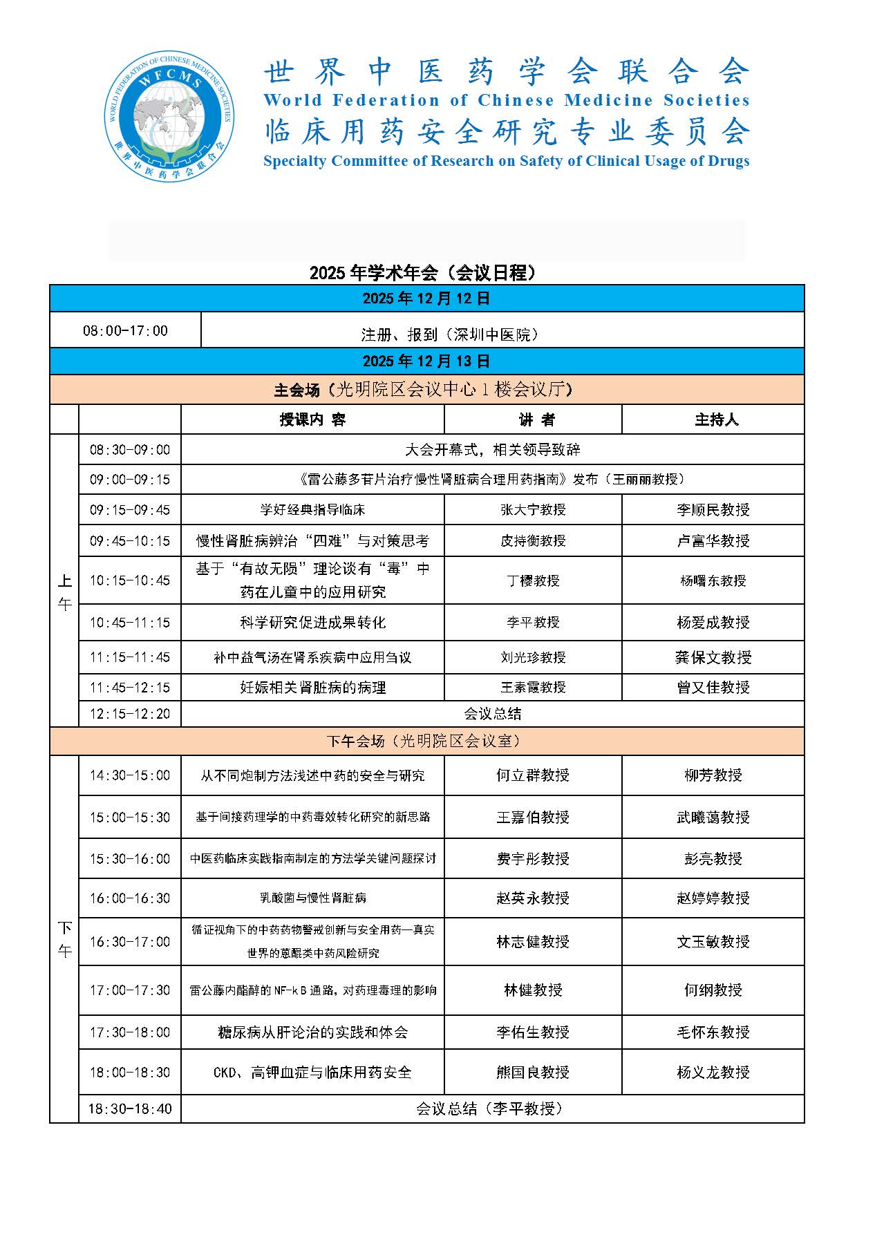 世界中医药学会联合会(简称“世界中联”)是经中华人民共和国国务院批准,在中国国家民政部登记注册,总部设在北京的国际学术组织,是世界卫生组织(WHO)非政府组织成员,国际标准化组织中医药技术委员会A级联络组织,联合国教科文组织非物质文化遗产保护咨询机构。世界中医药学会联合会临床用药安全研究专业委员会自2016 年9 月成立以来,在学会的领导下积极开展各项活动与工作。根据学会要求和专业委员会年度学术发展规划,推广临床安全用药的理念,普及中药安全用药和药物警戒知识,开展高层次、有特色、重实效的学术交流。由世界中医药学会联合会临床用药安全研究专业委员会主办,深圳市中医院、深圳市中医药学会肾病专业委员会和中日友好医院联合承办的“世界中医药学会联合会临床用药安全研究专业委员会2025年学术年会”将于2025年12月12-13日在深圳召开。