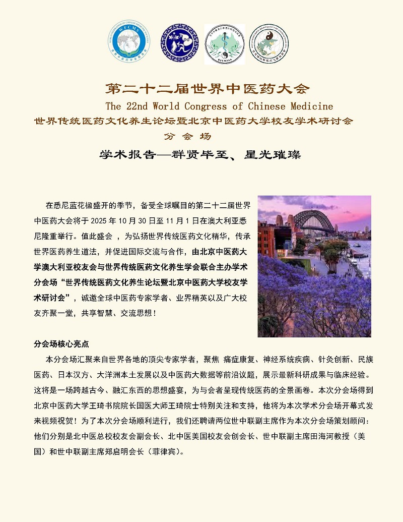 下一篇:第二十二届世界中医药大会分会场推介——(CN/EN)大洋洲中医药针灸学术研讨会
