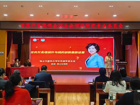 学术报告首先由任晓艳教授做主题为《任氏针灸埋线针与线的创新最新进展》的主旨报告,系统介绍了埋线针具的演变历程、技术创新与临床优势,并现场演示了操作手法,展示了“任针美学”在面部年轻化与整体抗衰老方面的应用前景。