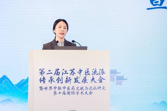 赵霞教授在致辞中简要介绍了南京中医药大学及江苏中医流派研究院的发展情况。她指出,南中医高度重视中医流派研究,系统开展了文献研究与学术挖掘并启动了中医医案大典编纂及中医大模型研发等工作。她强调,要汇聚各方智慧,运用人工智能等现代科学技术推动流派传承创新,促进中医流派学术繁荣与成果转化,让千年医脉焕发时代生机。