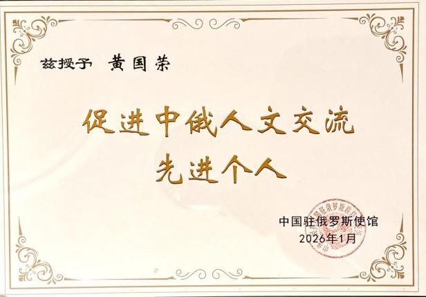 2026年1月30日,中国驻俄罗斯使馆举办旅俄中国同胞新春招待会。活动期间,使馆对推动中医药在俄罗斯发展、促进两国人文交流方面作出卓越贡献的先进单位和个人进行了表彰。世界中联执委、俄罗斯传统东方医学专家学会会长黄国荣获“促进中俄人文交流先进个人”称号,中国驻俄罗斯大使张汉晖为其颁奖。